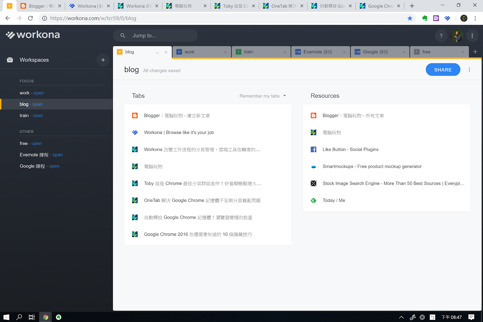 Workona 2 極速開關大量chrome 分頁 還能一鍵釋放記憶體